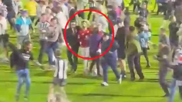 As security tried to remove the Grimsby supporters from the field, some of them taunted United’s players.